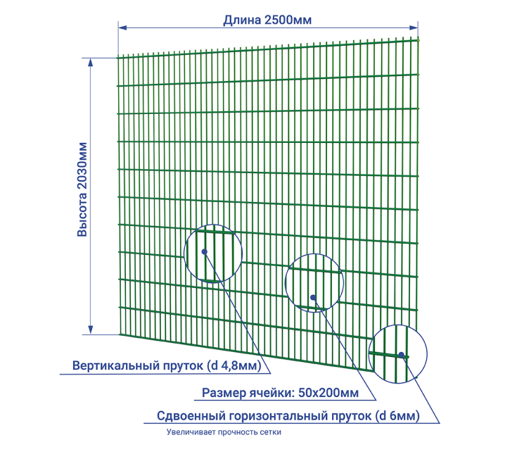 Сетка заборная 2D ОЦ ППК 2030х2500 мм / 50х200 мм / 4,8 мм / 6,0 мм / RAL 6005 - зеленый мох
