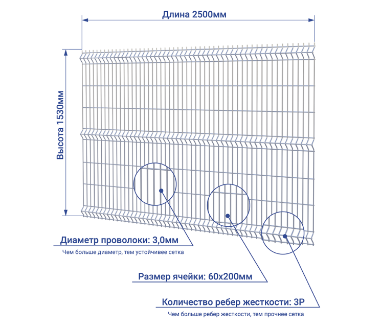 Размер 3D секции для забора с 3 ребрами жесткости - 1530х2500 мм.