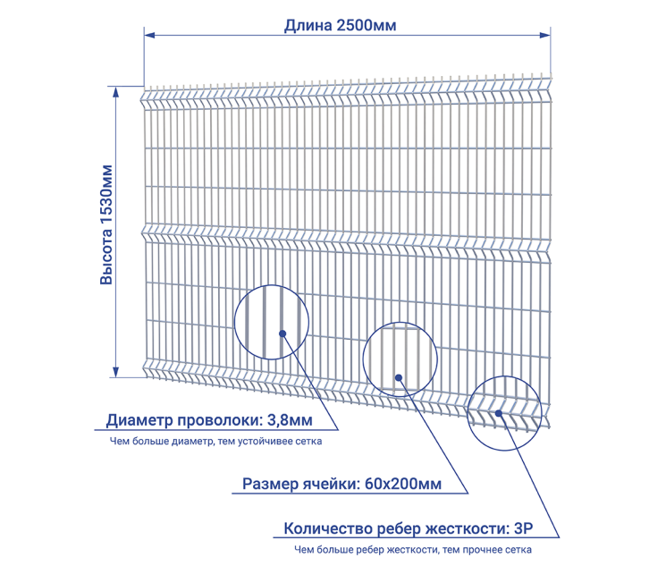Размер 3D секции для забора с 3 ребрами жесткости – 1530х2500 мм.