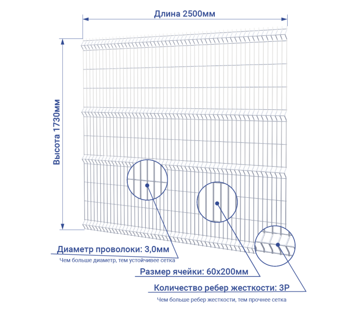 Размер 3D секции для забора с 3 ребрами жесткости – 1730х2500 мм.