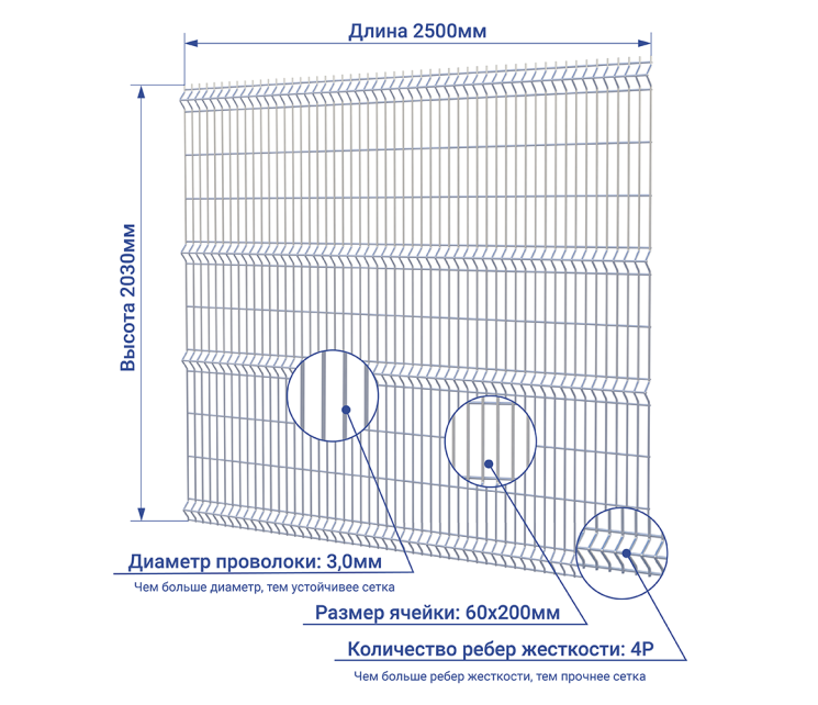 Размер 3D секции для забора с 4 ребрами жесткости – 2030х2500 мм.