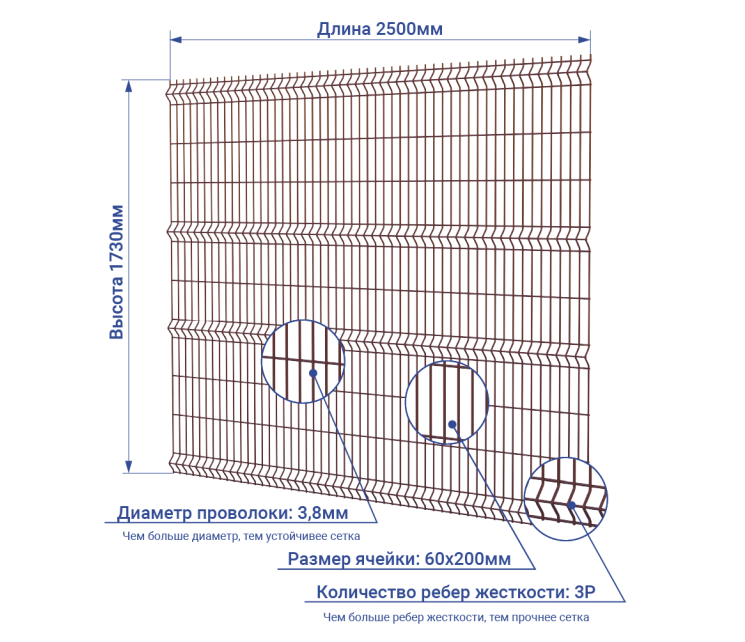 Сетка 3D заборная ОЦ ППК 1730х2500 мм / 60х200 мм / 3,8 мм / 3Р / RAL 8017 - шоколадно-коричневый