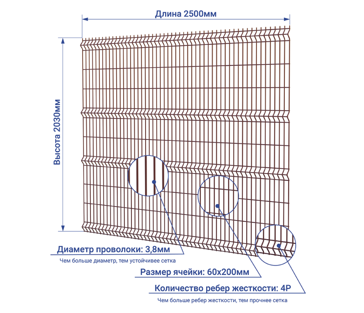 Сетка 3D заборная ОЦ ППК 2030х2500 мм / 60х200 мм / 3,8 мм / 4Р / RAL 8017 - шоколадно-коричневый