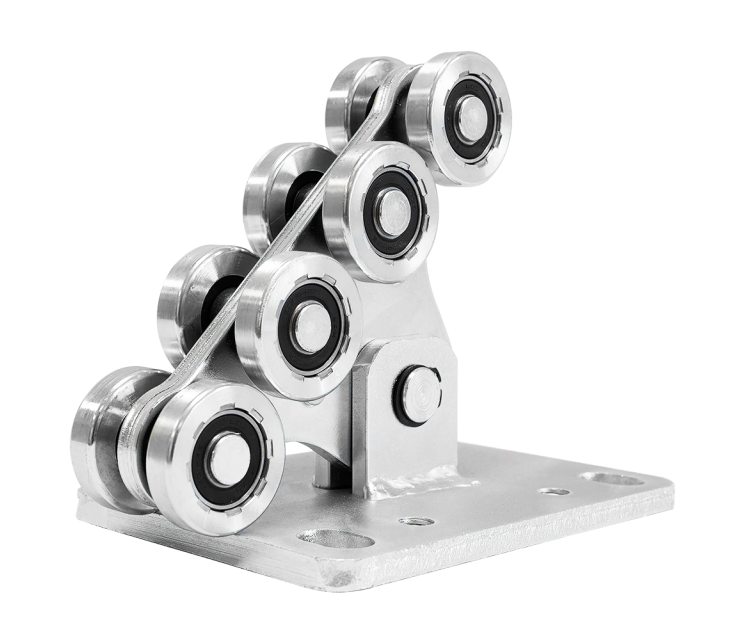 Данный элемент воспринимает полный вес ворот, а наличие восьми роликов позволяет использовать его в том числе для длинных ворот.