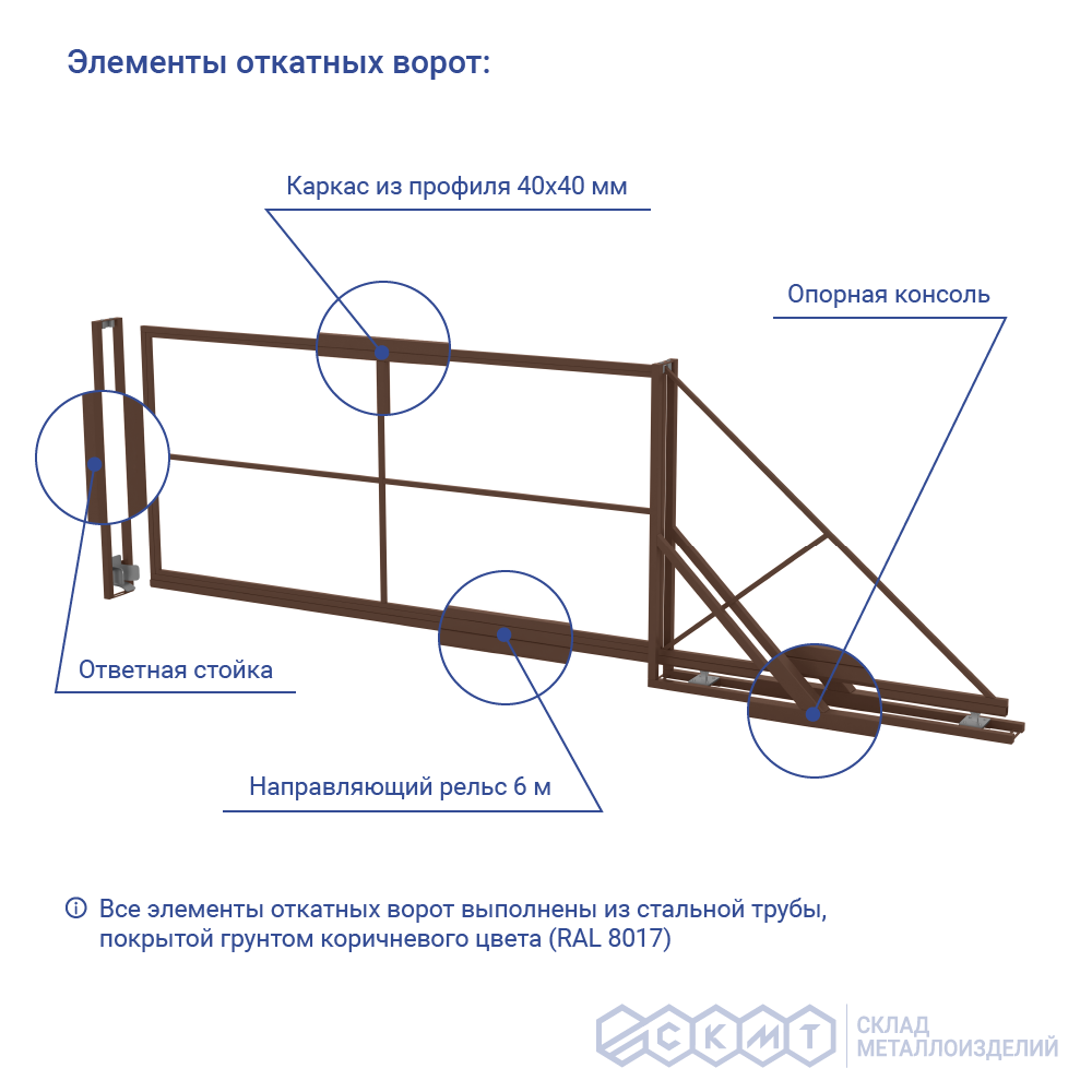 Все элементы откатных ворот выполнены из стальной трубы без покрытия и включают: