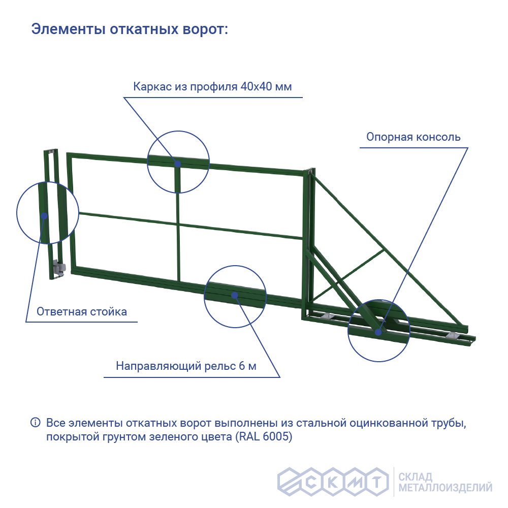Все элементы откатных ворот выполнены из стальной оцинкованной трубы и включают: