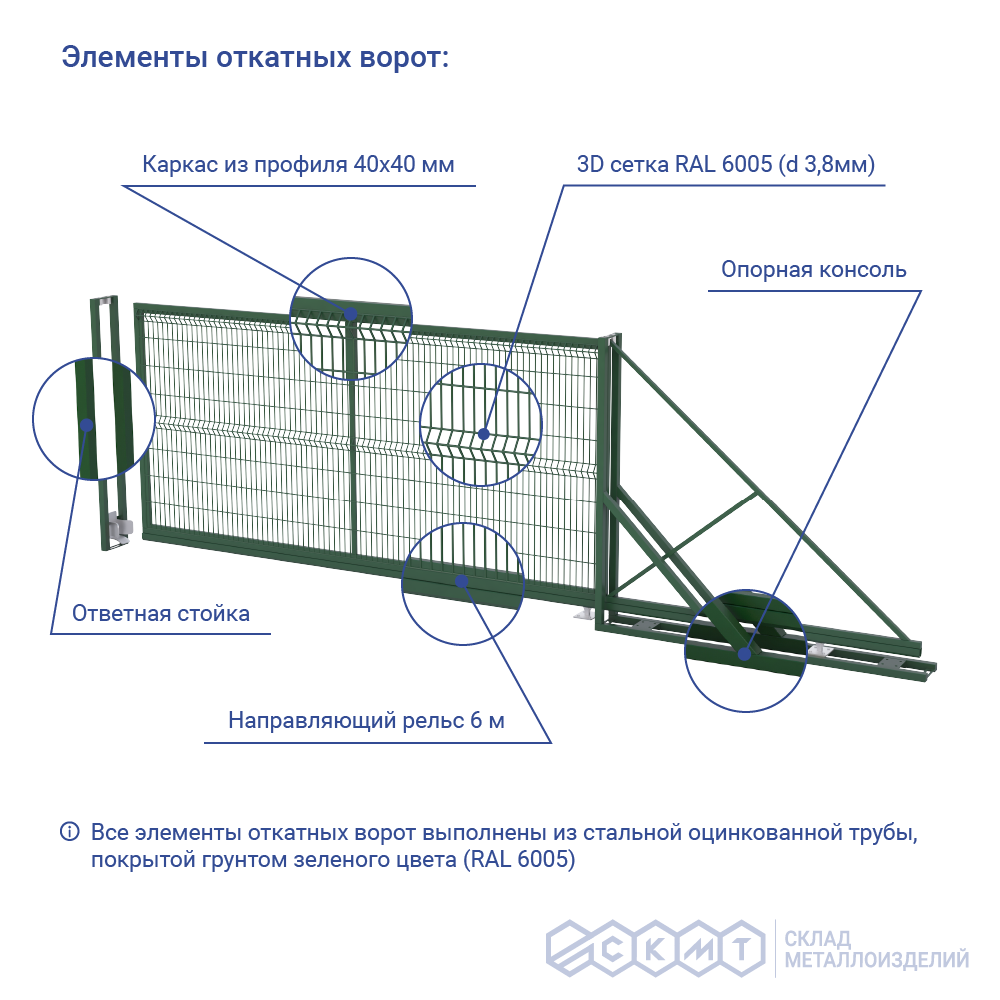 Все элементы откатных ворот выполнены из стальной оцинкованной трубы и включают: