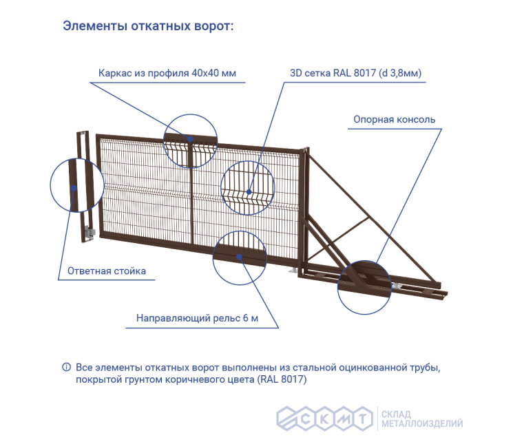 Все элементы откатных ворот выполнены из стальной оцинкованной трубы и включают: