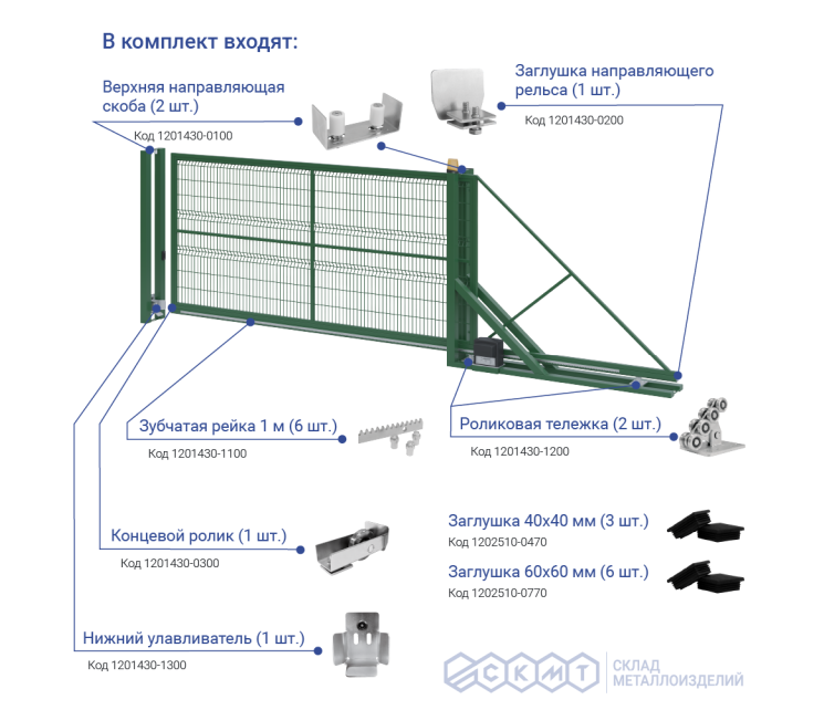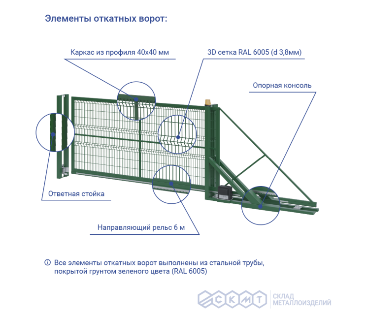 Данная модель ворот предполагает открытие вправо. Также откатные ворота производства СКМТ можно дополнительно автоматизировать.