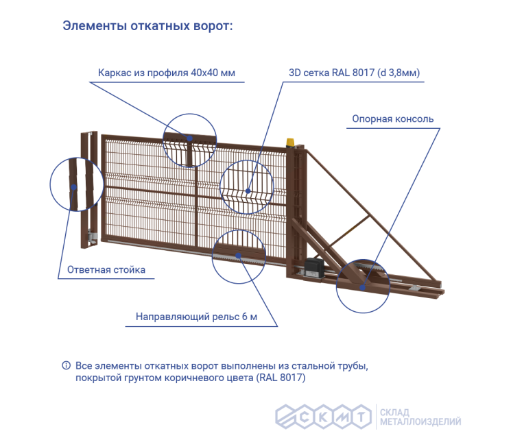 Все элементы откатных ворот выполнены из стальной трубы без покрытия и включают: