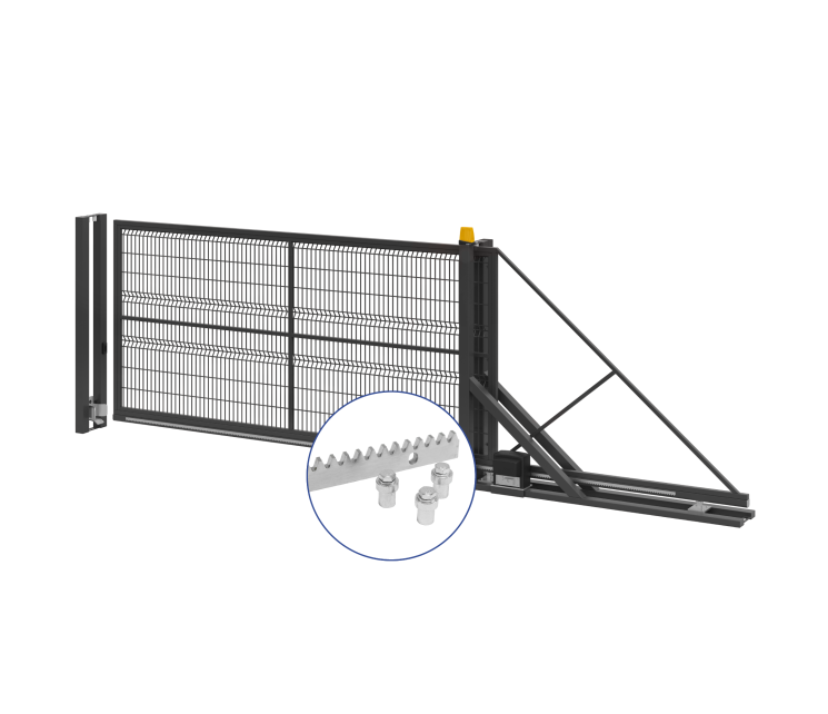 Откатные ворота производства ООО "Склад металлоизделий" предназначены для установки в проем длиной 4 метра. Данная модель относится к воротам консольного типа, пригодным для монтажа в условиях неровных дорожных покрытий за счет отсутствия направляющего рельса на земле.