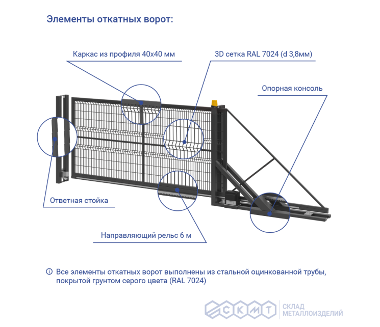 Все элементы откатных ворот выполнены из стальной оцинкованной трубы и включают: