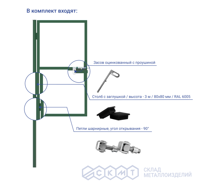 В комплектацию входят:- Столб из профильной трубы с заглушкой (1 шт.): высота – 3 м, размер – 80х80 мм;