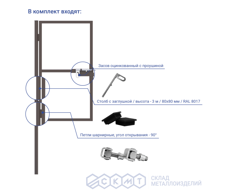 В комплектацию входят:- Столб из профильной трубы с заглушкой (1 шт.): высота – 3 м, размер – 80х80 мм;