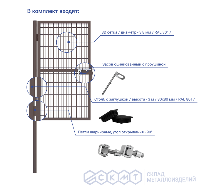 Каркас калитки производства ООО «Склад металлоизделий» изготовлен из профильной трубы 40х40 мм и заполнен сеткой 3D диаметром 3,8 мм. Ширина калитки - 1 м, высота - 1,96 м.