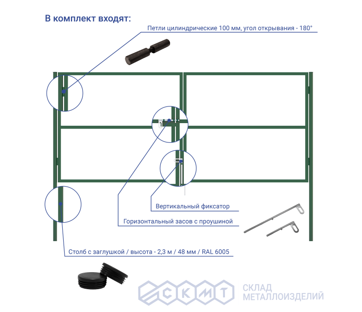 Фурнитура в комплектации:- Столб из круглой трубы с заглушкой (2 шт.): высота – 2,3 м, диаметр – 48 мм;