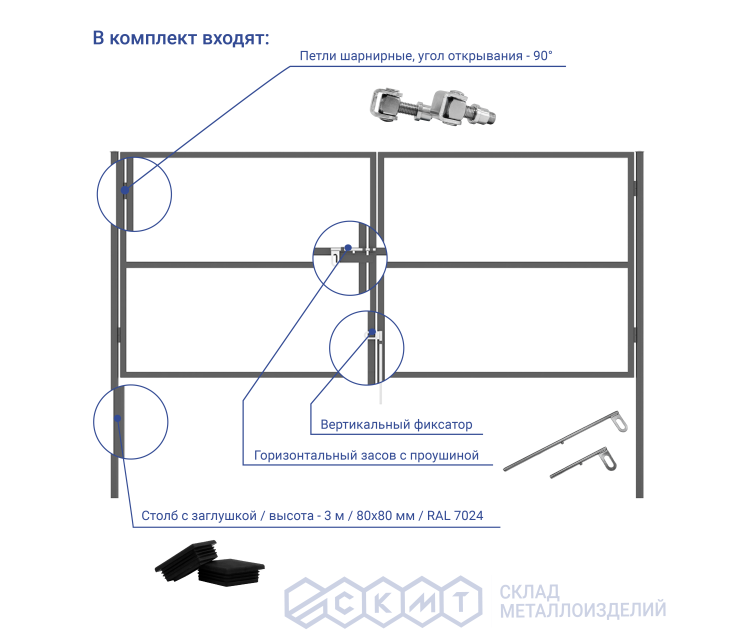 Фурнитура в комплектации:- Столб из профильной трубы с заглушкой (2 шт.): высота – 3 м, размер – 80х80 мм;