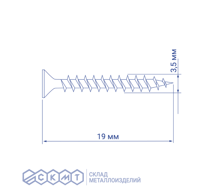 Саморезы гипрок-дерево диаметром 3,5 мм и длиной 19 мм с острым наконечником, потайной головкой и покрытием серый фосфат продаются в промупаковке размером 280х260х170 мм по 24000 шт.
