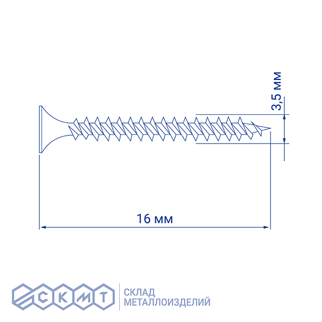 Саморезы гипсокартон-металл (ГМ, ШСГМ) 3,5х16 мм с потайной головкой предназначены для надёжного крепления гипрока к металлическому основанию. Такие самонарезающие шурупы с острым наконечником применяют в строительстве, мебельном производстве и бытовом ремонте.