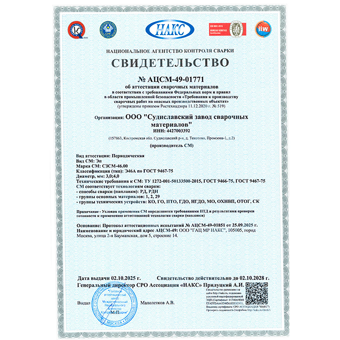 Электроды СЗСМ-46.00 диаметром 4 mm с рутиловым покрытием предназначены для зажигания и обеспечения стабильной дуги, формирования качественного сварного шва, а также наплавления металла. Подходят для ручной дуговой сварки (MMA) инвертором низколегированных сталей на переменном и потсоянном токе обратной полярности с повышенными требованиями по ударной вязкости и пластичности шва.